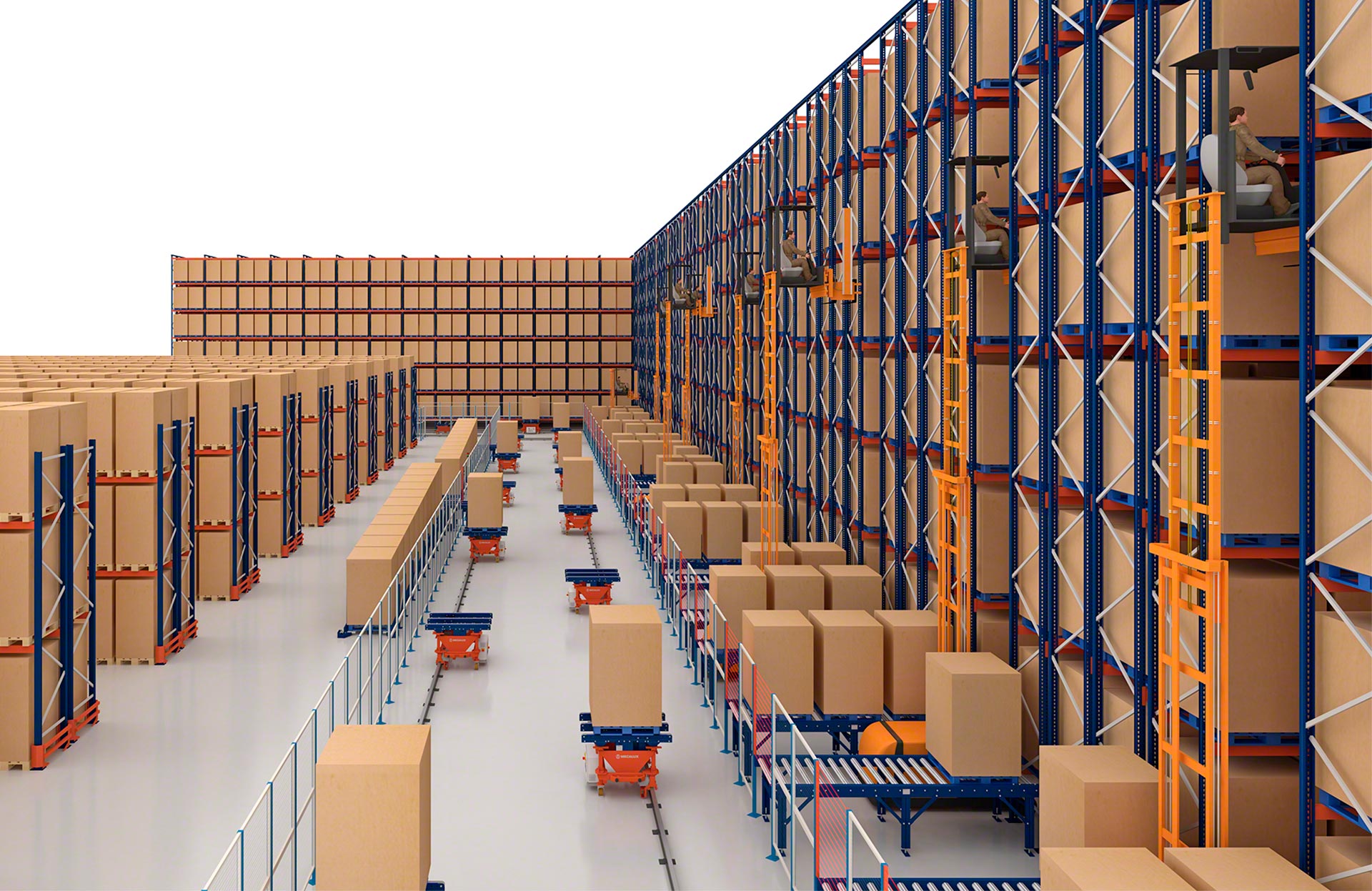 Automatyczne rozwiązanie transportu bliskiego palet składające się z samojezdnych wózków przemieszczających się po szynach w obiegu zamkniętym.