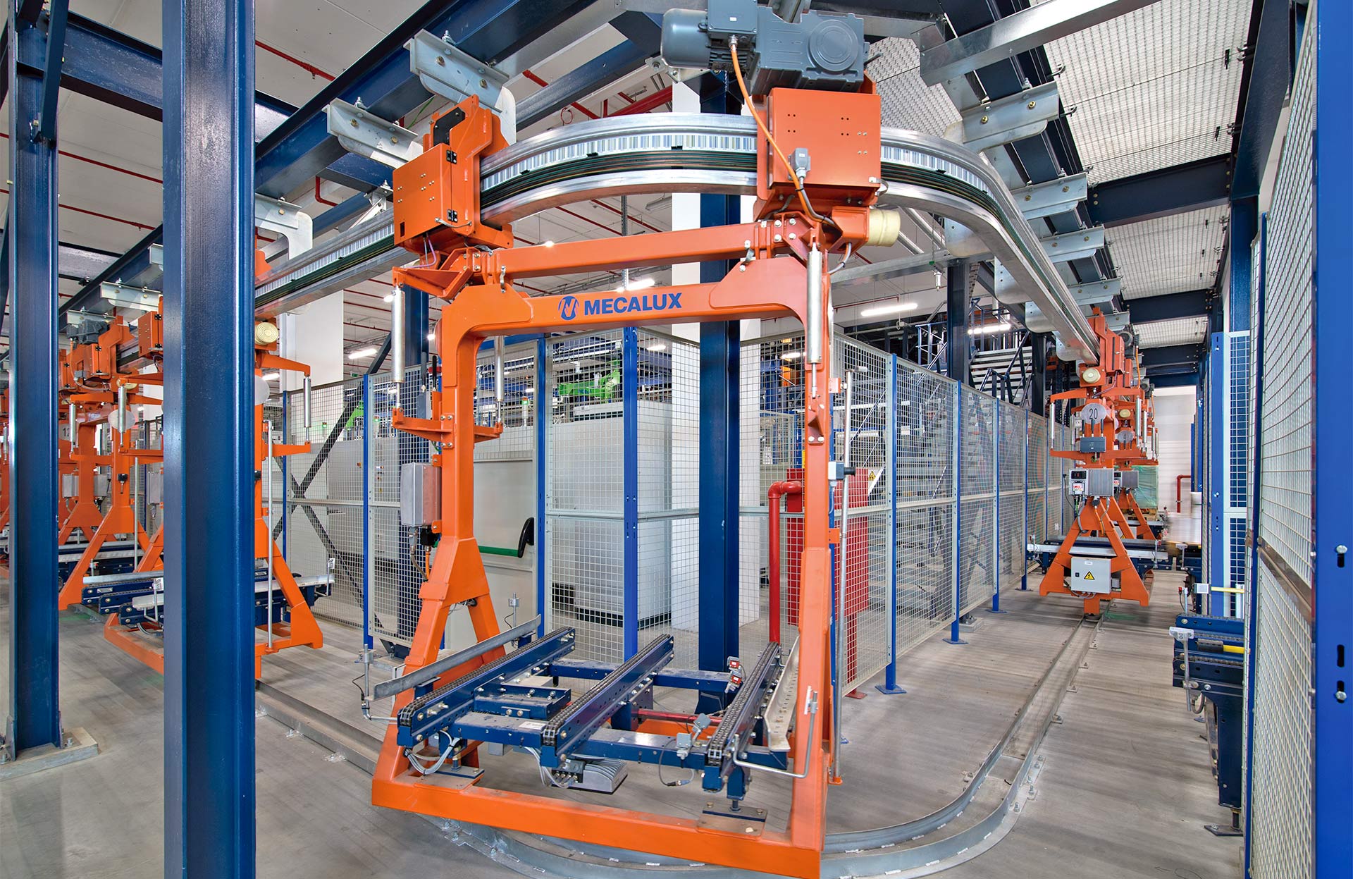 Wózki są kontrolowane przez oprogramowanie sterujące ruchem, które przypisuje im najkorzystniejsze trasy przejazdu dostosowane do wykonywanego zadania. Elektryczne systemy jednoszynowe Mecaluxu dynamizują wewnętrzny obieg ładunków w magazynach i centrach produkcyjnych każdego typu.