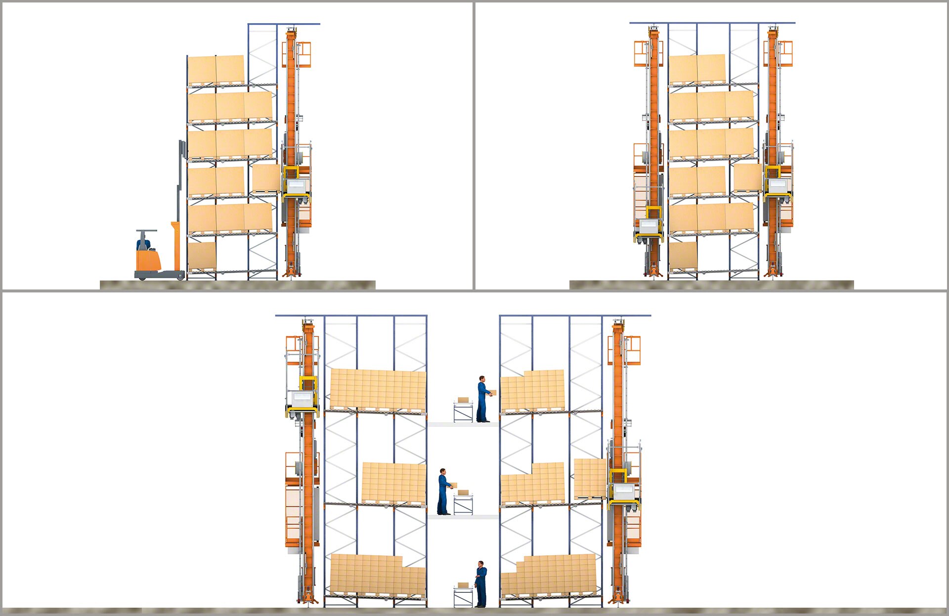 Układnice Mecalux są skonfigurowane do pracy w trzech trybach: automatycznym (domyślny tryb działania), półautomatycznym (pojedyncze operacje i zadania wspierające inne procesy) oraz manualnym (do prac konserwacyjnych). Układnica w trybie automatycznym wykonuje polecenia otrzymywane z oprogramowania zarządzającego, które polegają na odkładaniu lub pobieraniu jednostki ładunkowej, zmianie lokalizacji czy ich zapamiętywaniu dzięki sekwencjom samokształcącym.