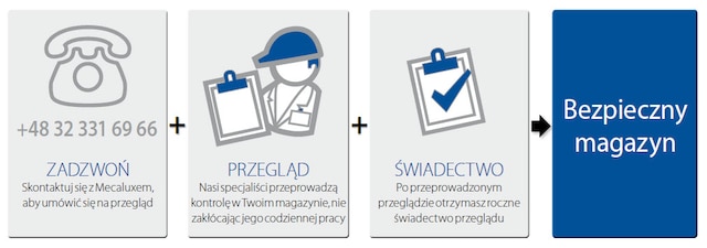 Czy przegląd będzie zakłócał codzienną pracę magazynu? Nie, specjaliści z Mecaluxu przeprowadzą przegląd w Twoim magazynie, nie przeszkadzając w jego normalnym funkcjonowaniu. |