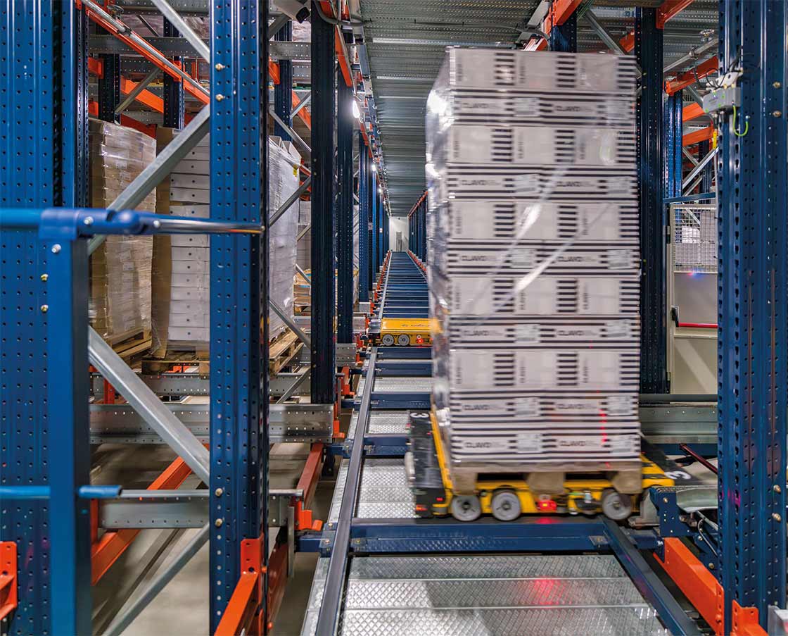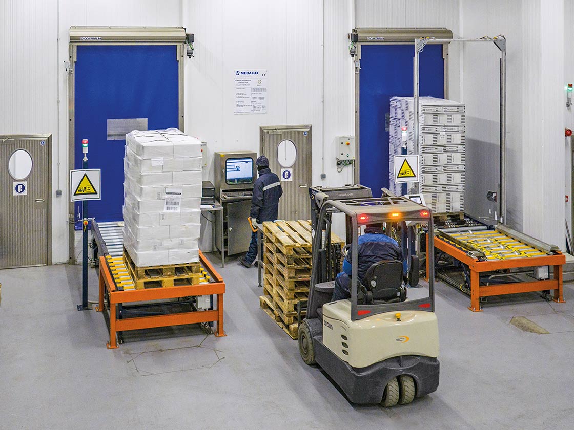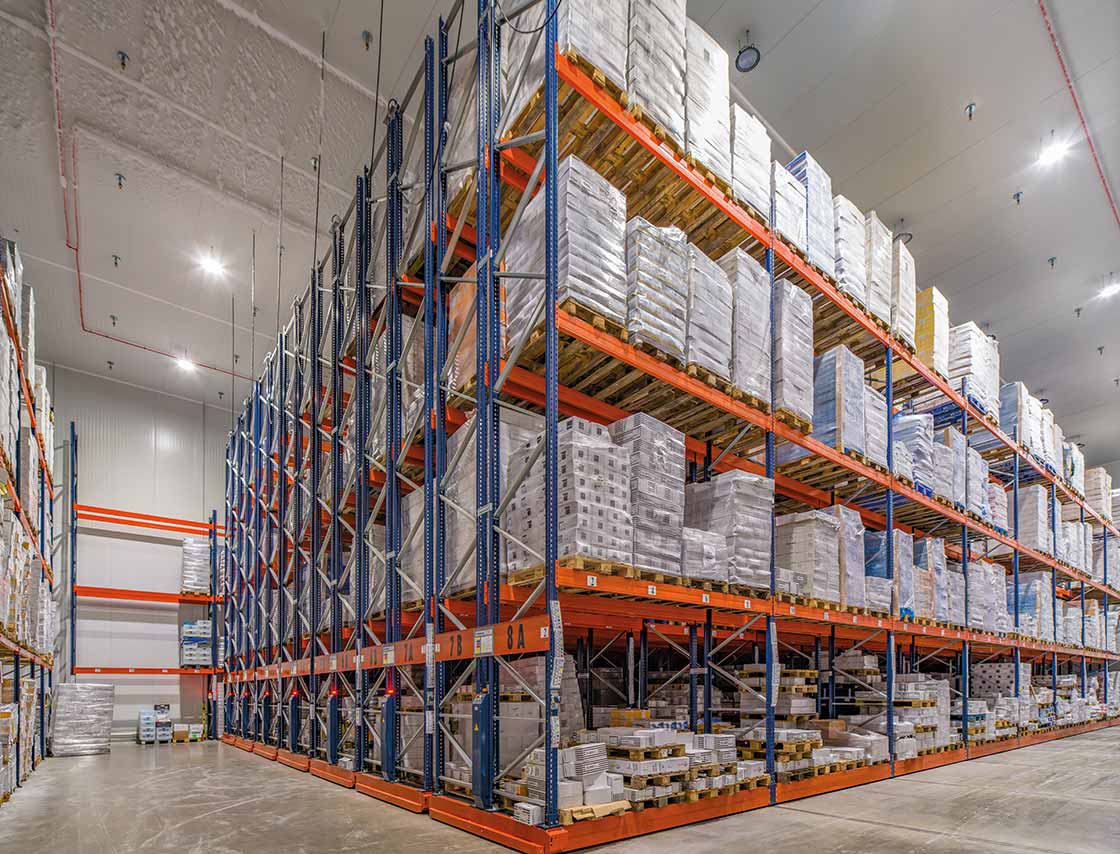 Automatyczny Pallet Shuttle 3D umożliwia składowanie 5827 palet z surowcami i gotowymi produktami w temperaturze wynoszącej -24ºC. Wewnątrz magazynu dziesięć autonomicznych wózków Pallet Shuttle przemieszcza się po korytarzach w wielu kierunkach i w sposób skoordynowany zmienia poziomy, aby obsłużyć każdą paletę zgodnie z wymogami operacyjnymi. System zarządzania flotą opracowany przez Mecalux monitoruje ruch wózków, co gwarantuje ciągłą i płynną pracę.