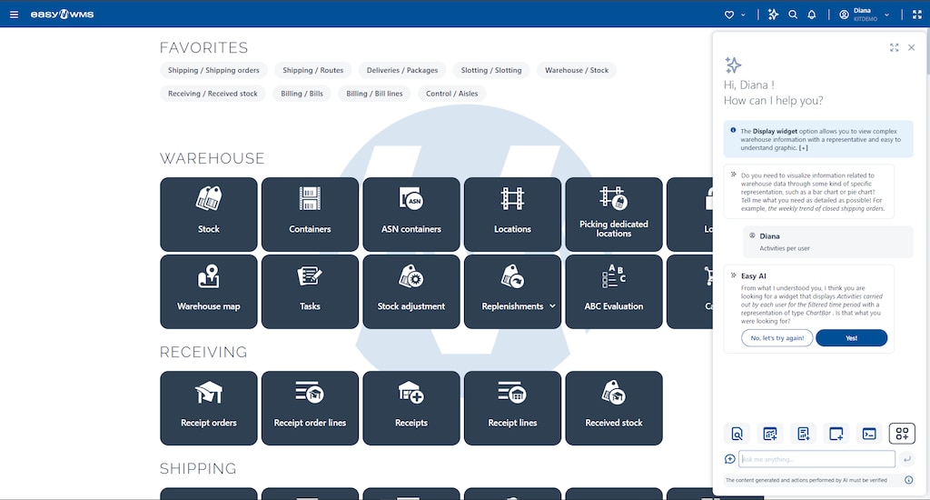 Z poziomu interfejsu użytkownika Easy WMS można teraz uzyskać dostęp do chatbota opartego na Easy AI , który umożliwia przyspieszenie codziennych zadań w magazynie, usprawnienie procesów, efektywniejszy dostęp do danych i minimalizację potencjalnych błędów ludzkich.