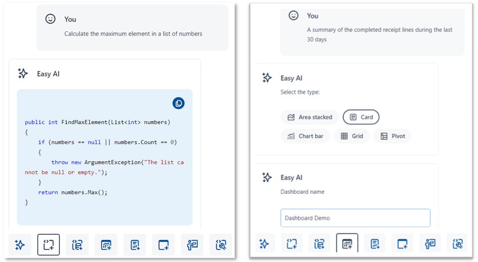 - Tworzenie dashboardów. Easy AI prowadzi dialog z programistą celem uzyskania informacji do wygenerowania w pełni funkcjonalnego dashboardu w wybranej aplikacji. Zaawansowany użytkownik może następnie ręcznie edytować i projektować dashboard, korzystając z wbudowanego narzędzia.
