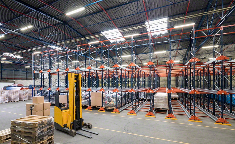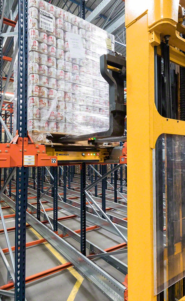 Mecalux wyposażył magazyn w blok regałów wjezdnych obsługiwany za pomocą automatycznych wózków Pallet Shuttle. Regały te mają 6,5 m wysokości i 62 m długości. Składają się ze 129 kanałów mieszczących do 18 palet na głębokość. Taki system doskonale sprawdza się w przypadku wielu palet z tym samym produktem.