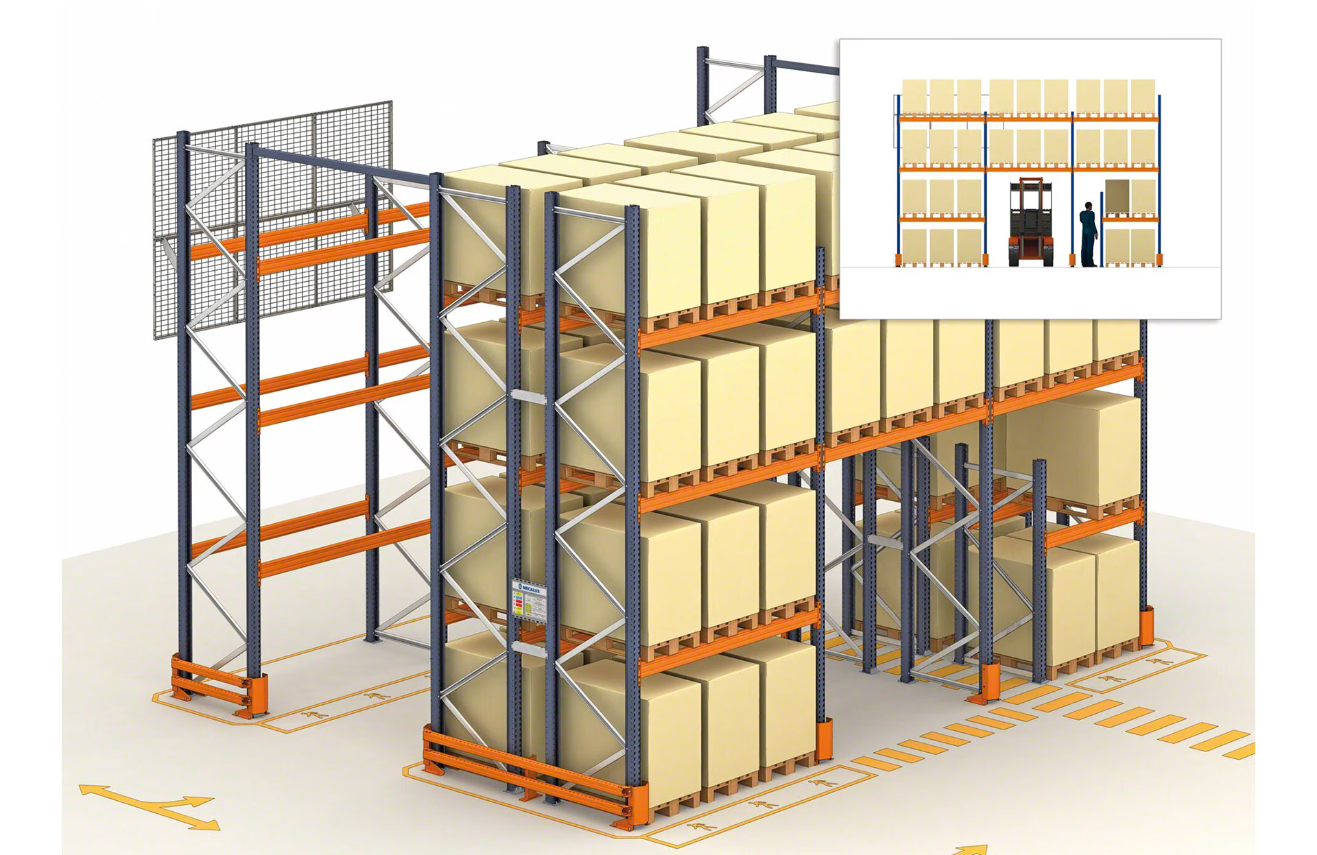 Regały paletowe Mecaluxu są produkowane zgodnie z najwyższymi standardami jakości i są wyposażone w różne elementy zabezpieczające. Szeroka gama słupów, belek nośnych, półek i podpór umożliwia projektowanie magazynów spełniających nawet najbardziej wymagające potrzeby.