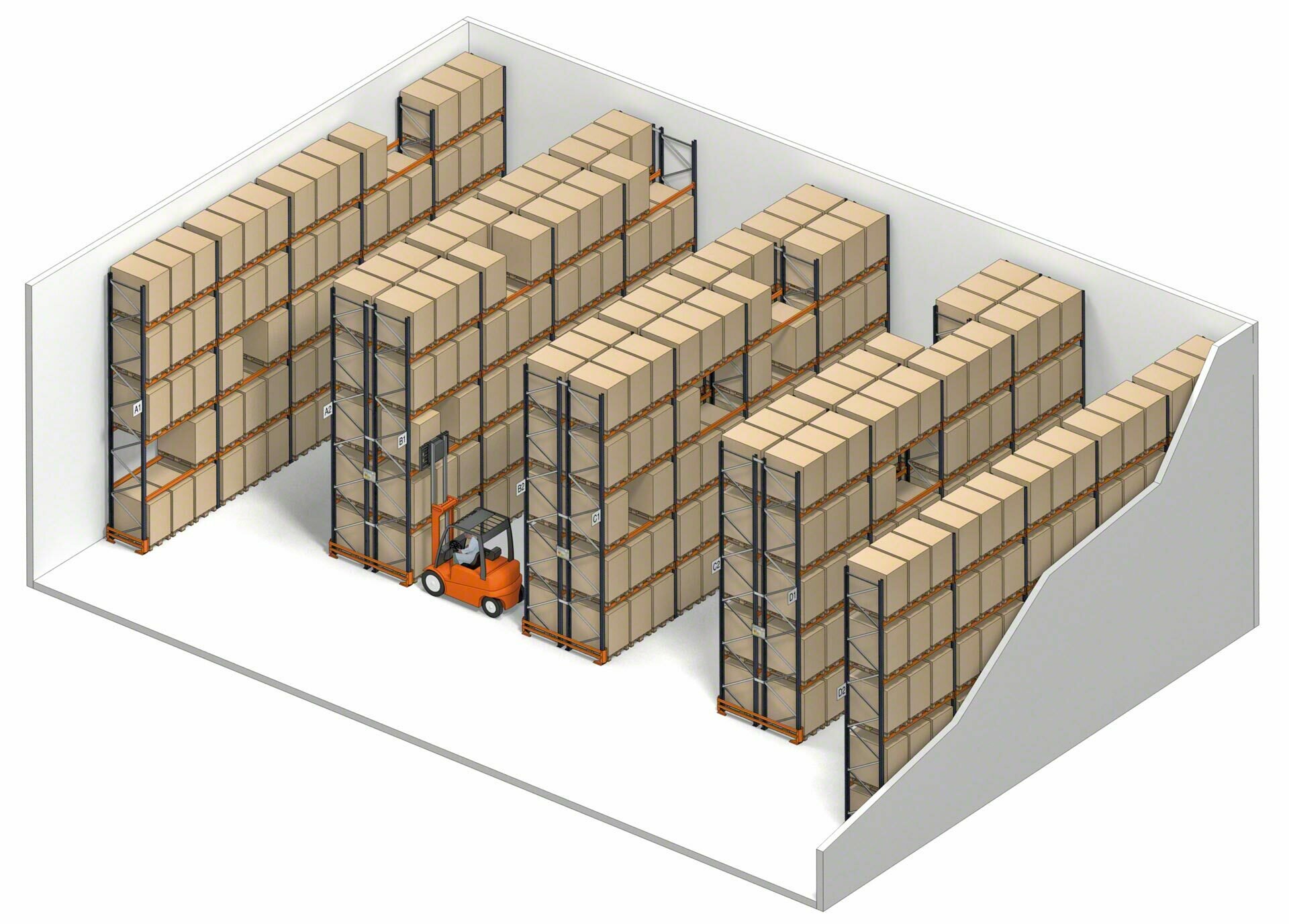 Można zastosować dowolny rodzaj wózka (wózek widłowy z przeciwwagą, wózek z wysuwanym masztem, wózek typu wieżowego) pod warunkiem, że szerokość korytarza będzie wystarczająca, a urządzenia mają możliwość sięgania wysokich poziomów ładunkowych. W przypadku regałów podwójnej głębokości należy zastosować wózek z widłami teleskopowymi, które umożliwią pobieranie oddalonych ładunków.