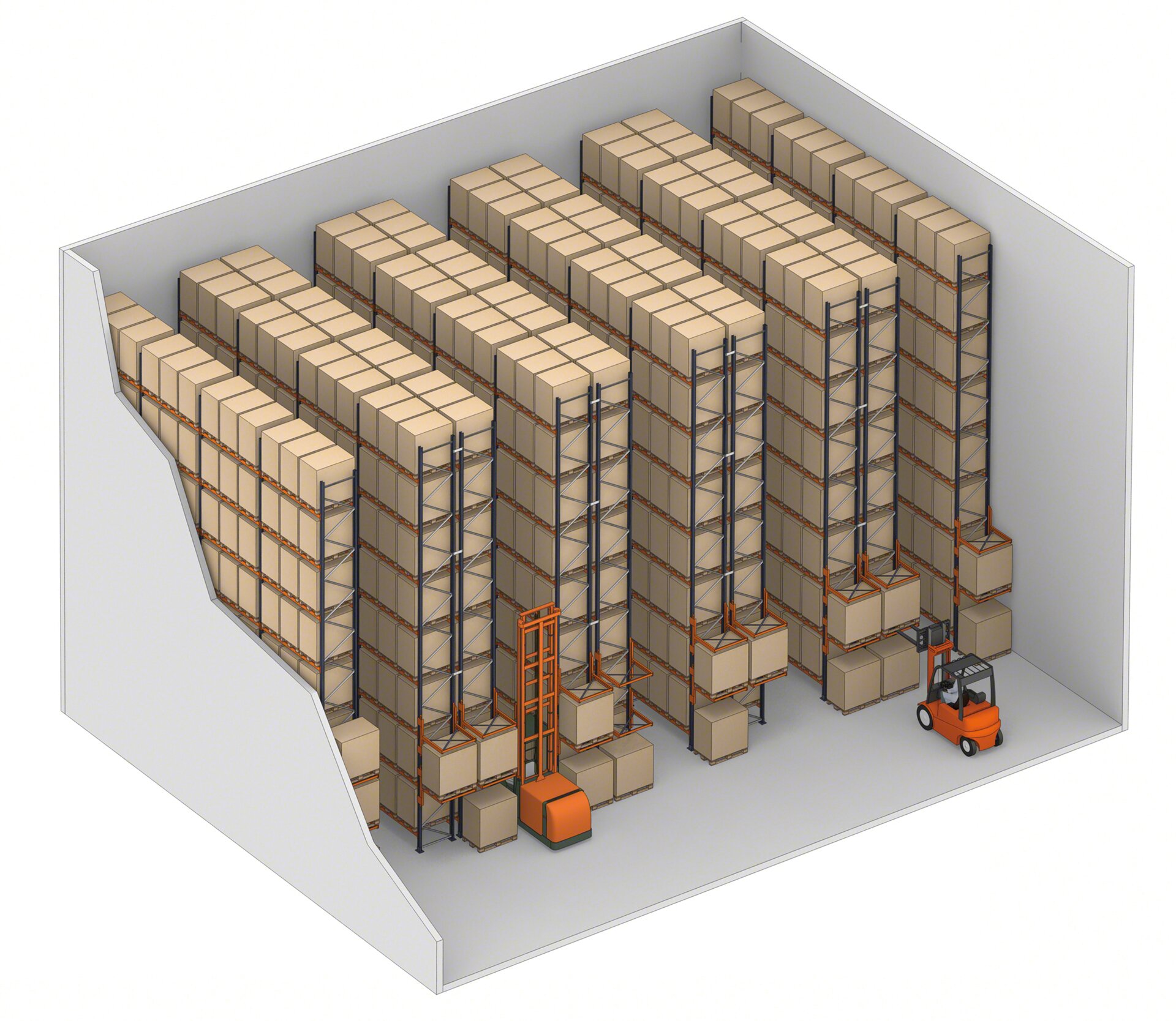 Można zastosować dowolny rodzaj wózka (wózek widłowy z przeciwwagą, wózek z wysuwanym masztem, wózek typu wieżowego) pod warunkiem, że szerokość korytarza będzie wystarczająca, a urządzenia mają możliwość sięgania wysokich poziomów ładunkowych. W przypadku regałów podwójnej głębokości należy zastosować wózek z widłami teleskopowymi, które umożliwią pobieranie oddalonych ładunków.