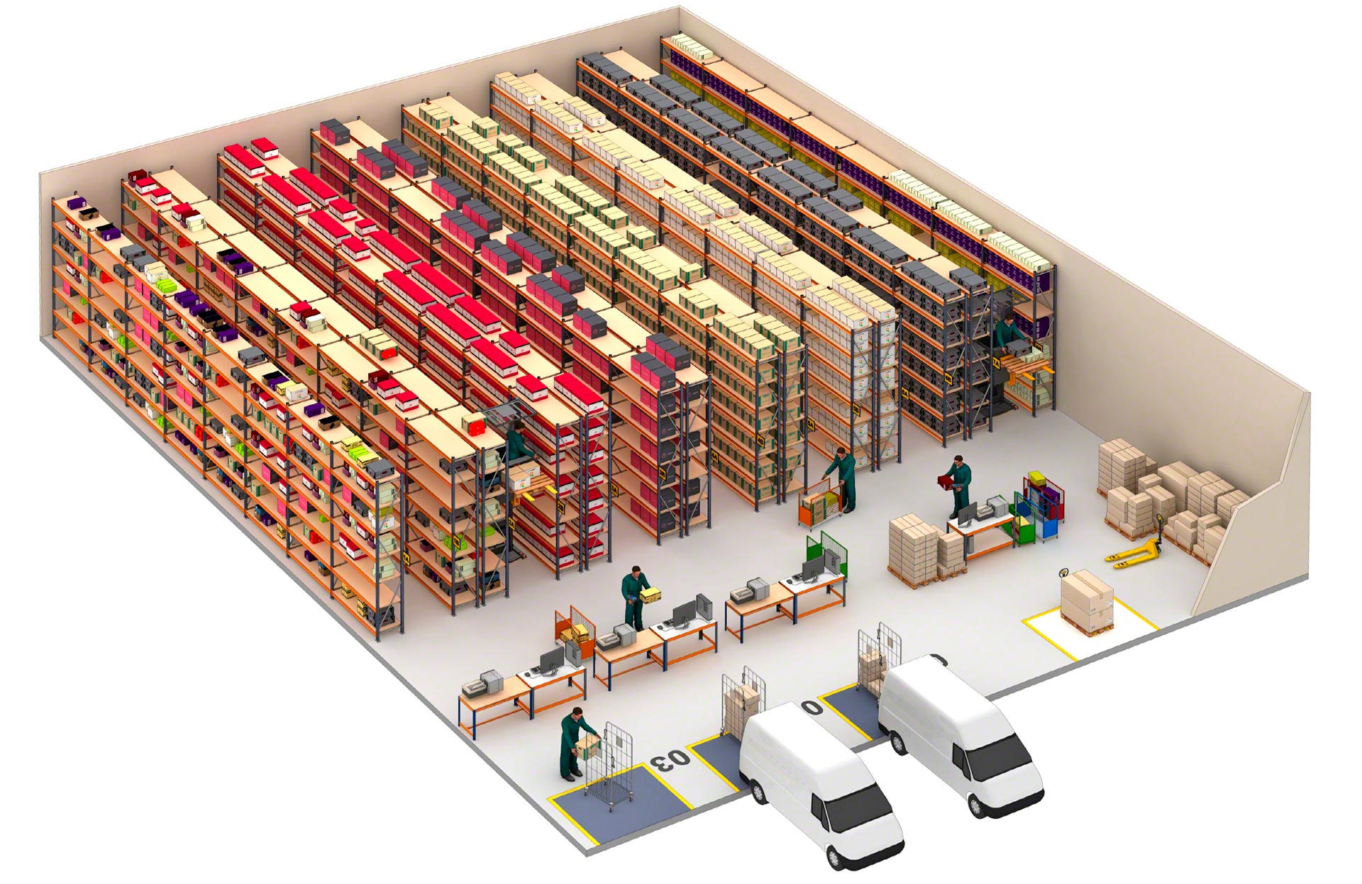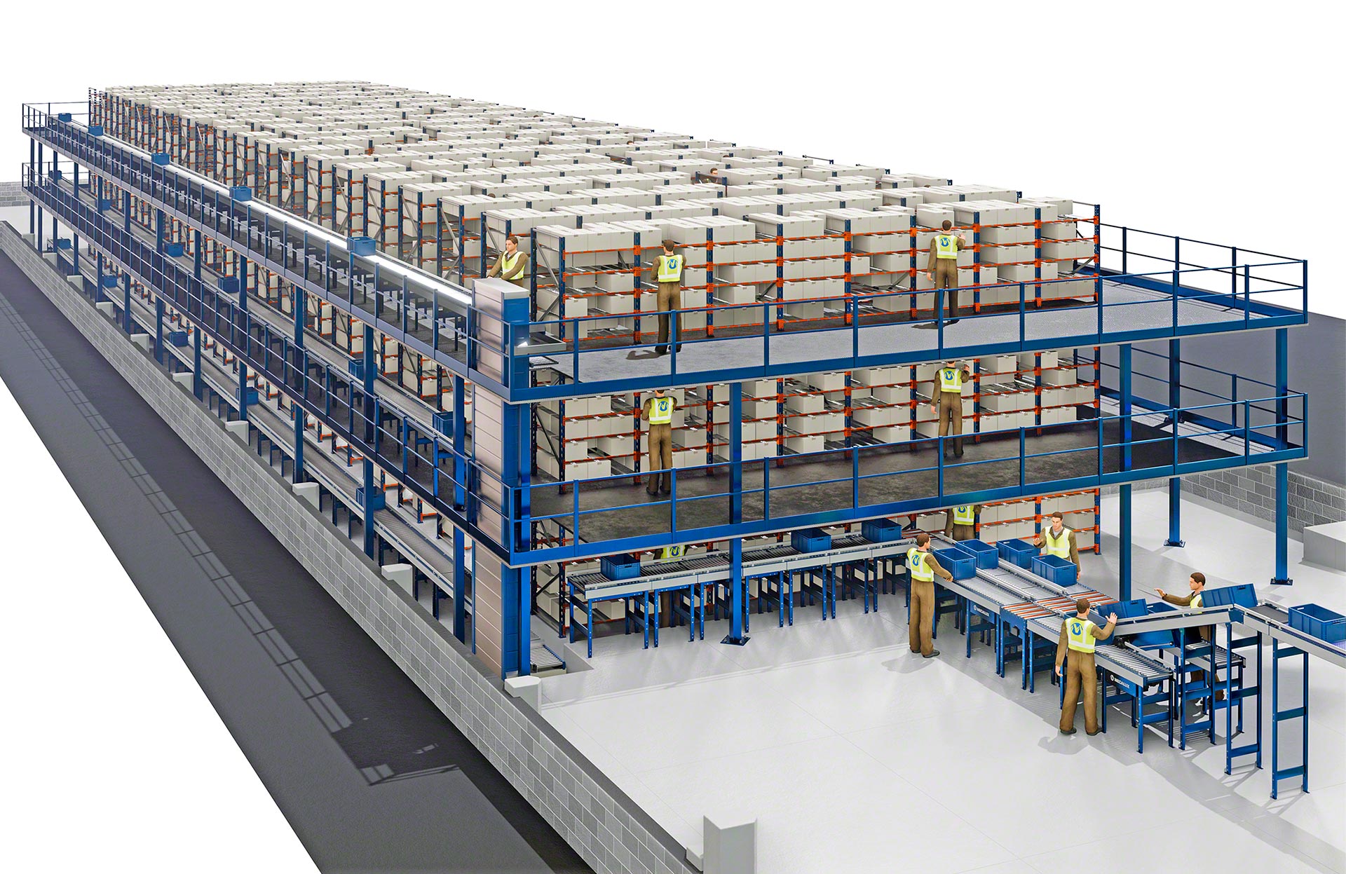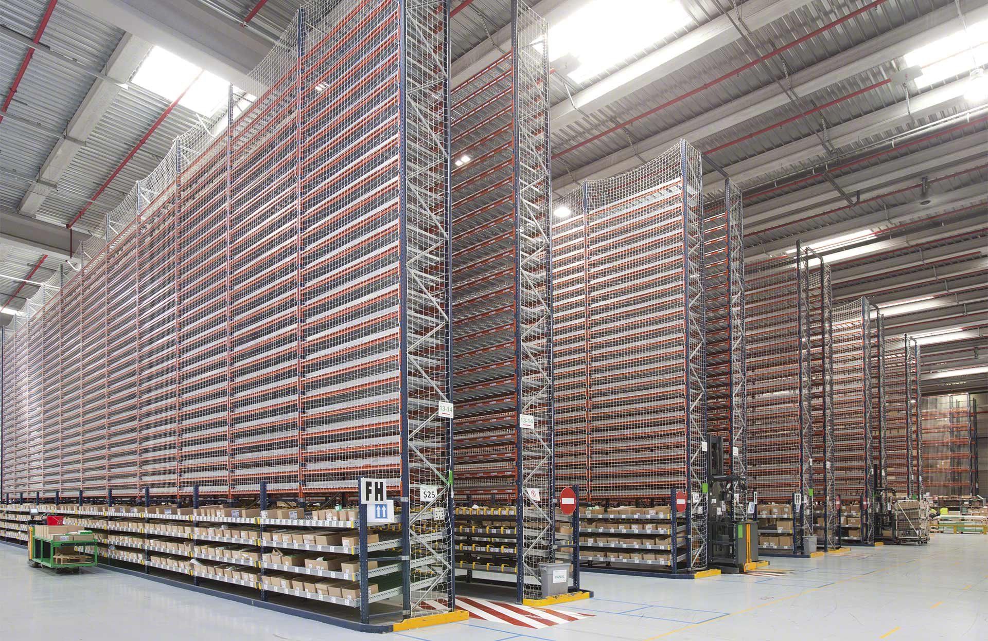 - Optymalizacja powierzchni składowania na wysokość: można zaprojektować regały o wysokości do 12 m obsługiwane za pomocą wózków do kompletacji zamówień lub do 20 m wysokości z dostępem do górnych poziomów składowania dzięki pomostom.