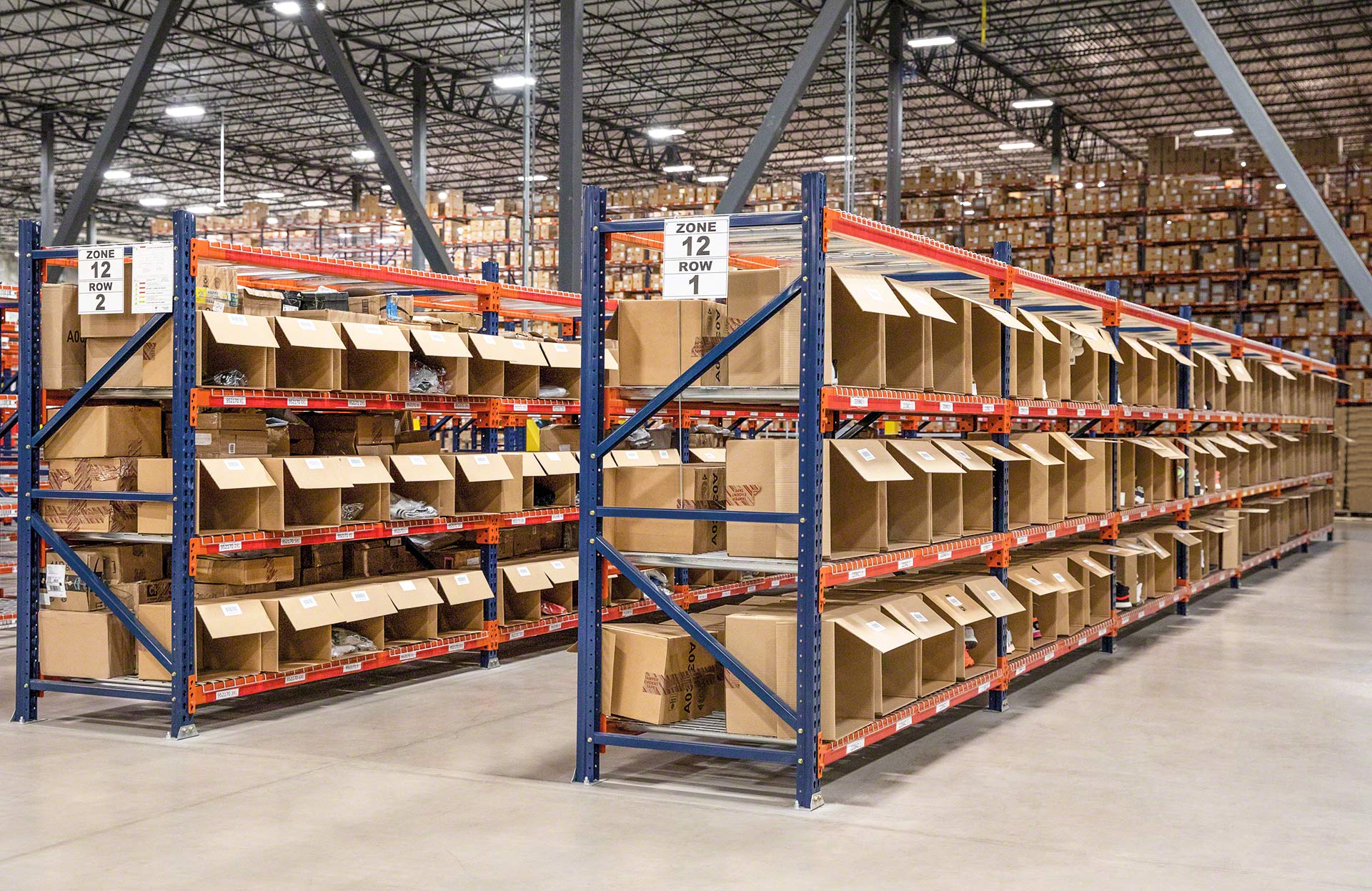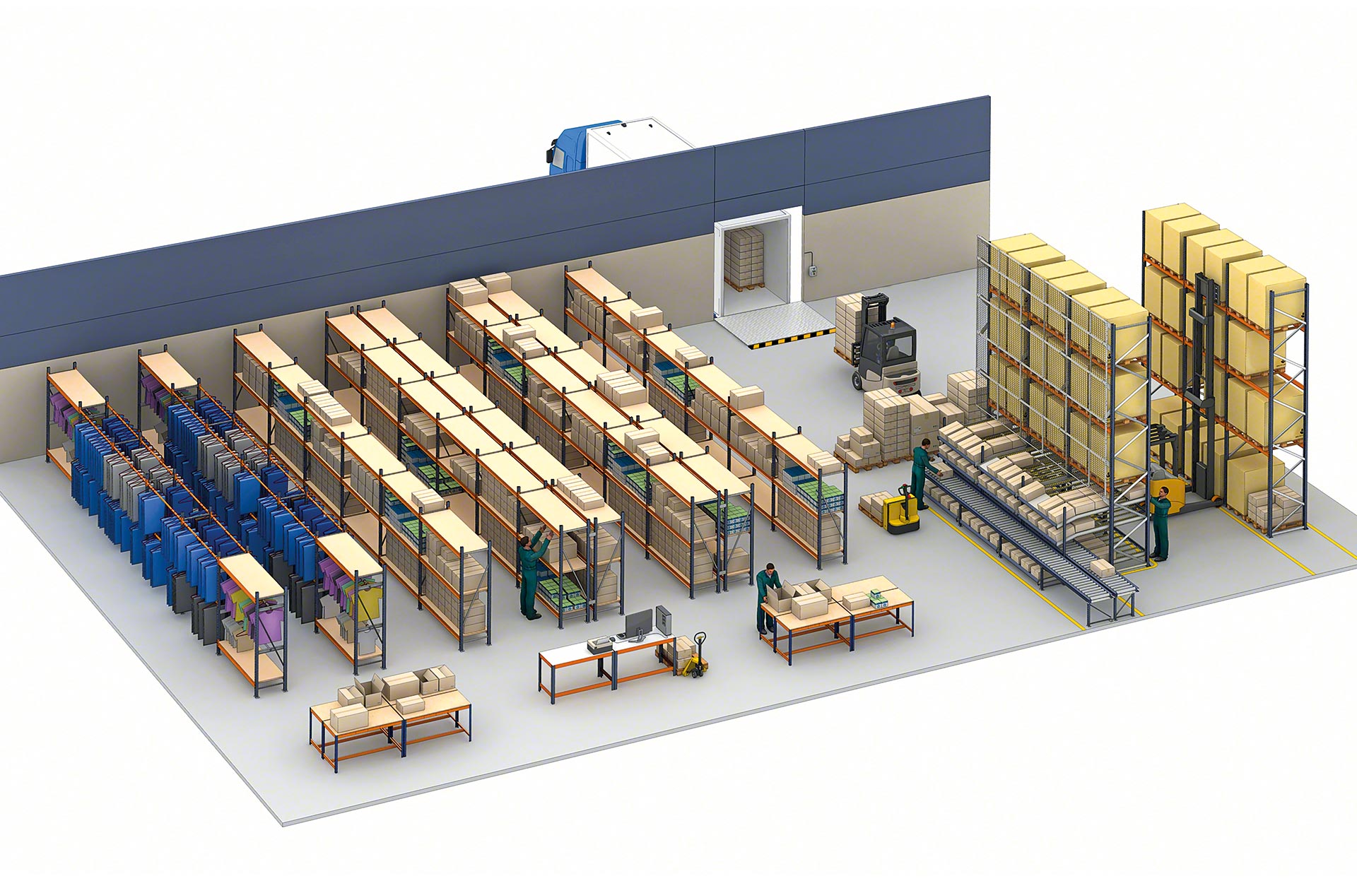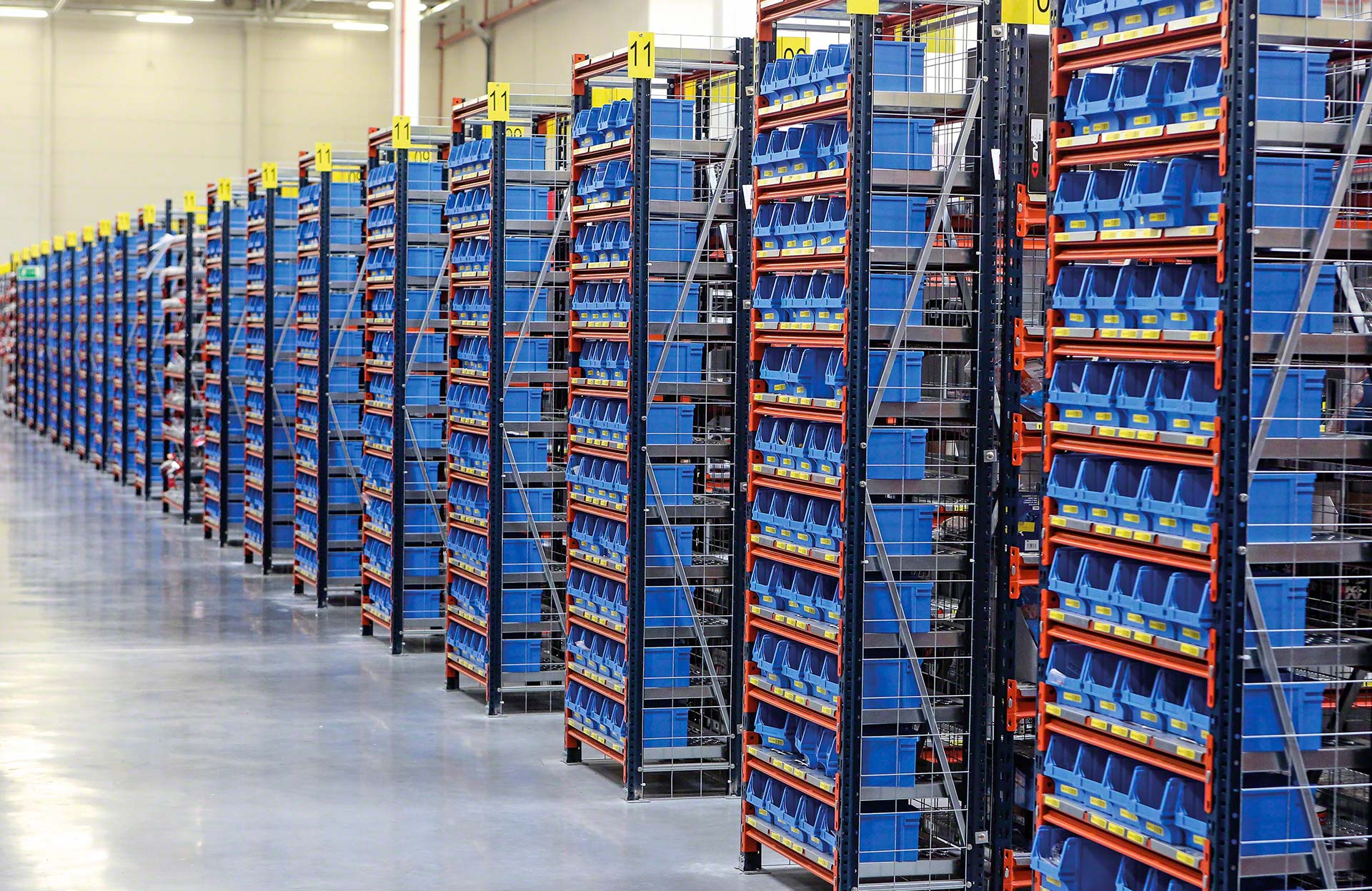 - Optymalizacja powierzchni składowania na wysokość: można zaprojektować regały o wysokości do 12 m obsługiwane za pomocą wózków do kompletacji zamówień lub do 20 m wysokości z dostępem do górnych poziomów składowania dzięki pomostom.