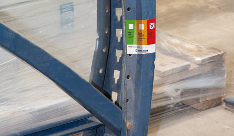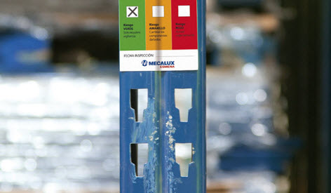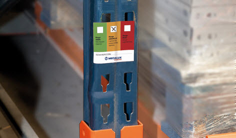 Podczas przeglądów przeprowadzanych przez Mecalux sprawdzany jest ogólny stan regałów, a ewentualne uszkodzenia są klasyfikowane pod względem poziomu ryzyka, który zaznacza się na etykiecie naklejonej na regał.